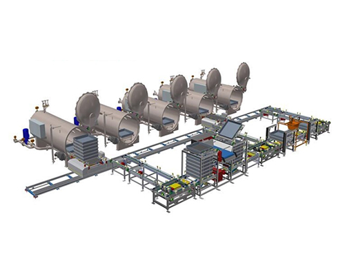 原理:高溫殺菌非標自動生產(chǎn)線,該設(shè)備由裝卸籠機、籠框移栽機、液壓升降機、滅菌釜(釜內(nèi)傳送裝置、自動開門裝置)等組成。